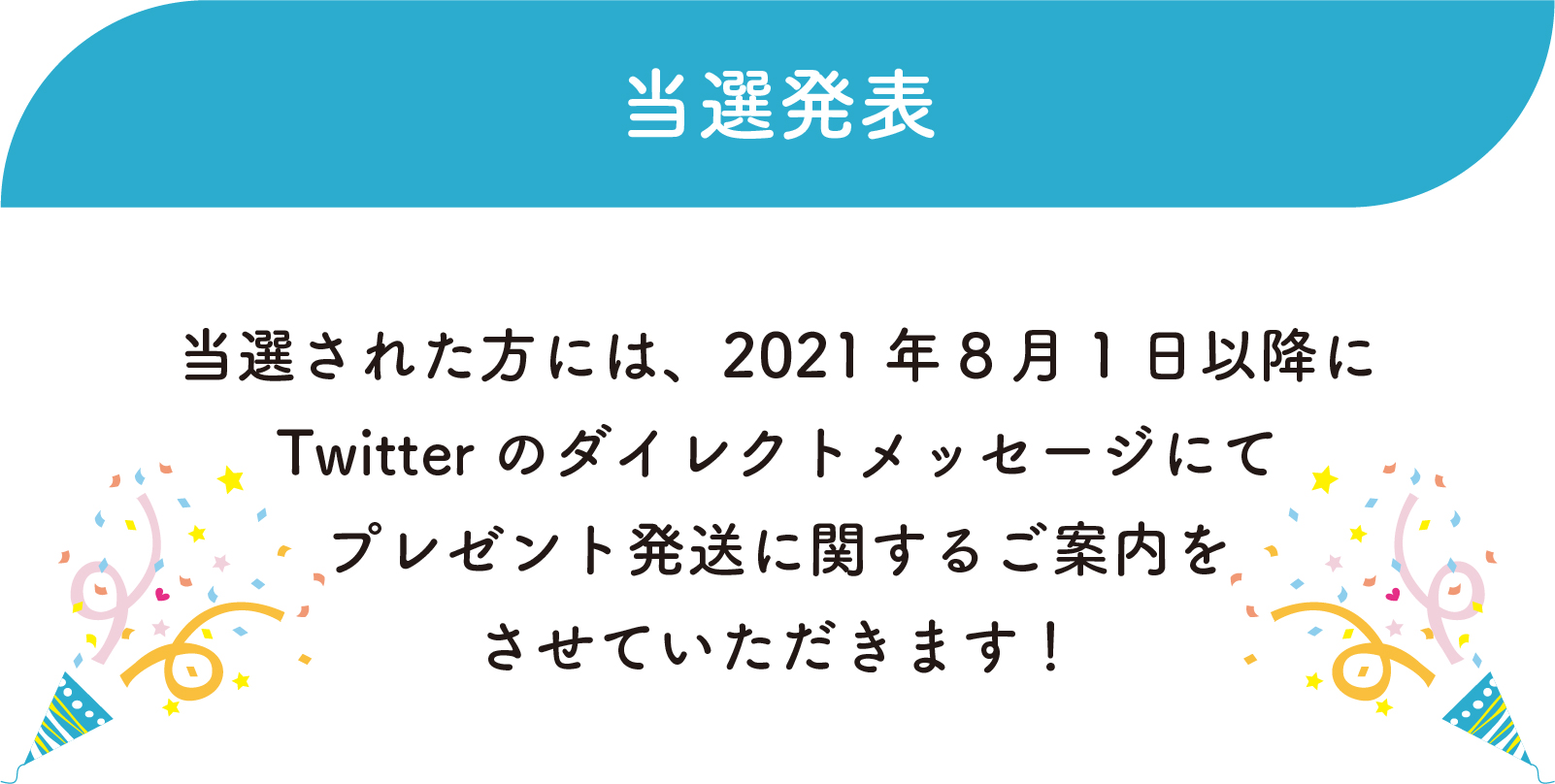 ・応募者の中から抽選のうえ、当選者を決定いたします。 ・当選者のみに、フォローいただいた公式アカウントからダイレクトメッセージをお送りし、プレゼント発送に関するご案内をさせていただきます。 ・ダイレクトメッセージの送信はご当選した時点、プレゼントの発送は2021年8月中を予定しておりますが、諸事情により遅れることがございます。