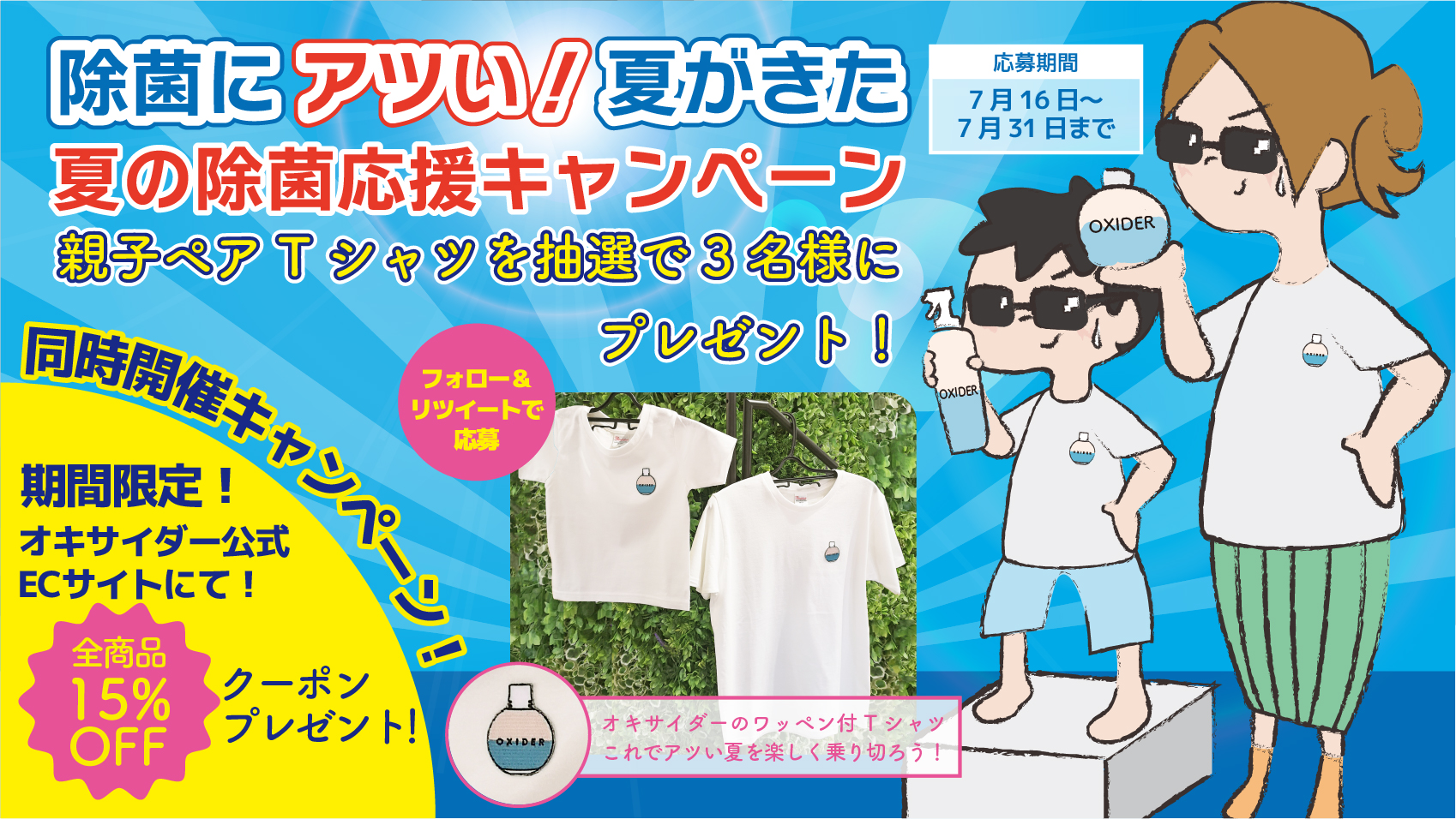 ① Twitterのアカウントを公開に設定したうえで、オキサイダー キャンペーンのアカウント(@OXIDER_CLO2Lab)(以下「公式アカウント」といいます)をフォローしてください。 ② ハッシュタグ「#除菌にアツい夏がきた」を含む指定の公式キャンペーンツイートをRTして頂ければ応募完了です。