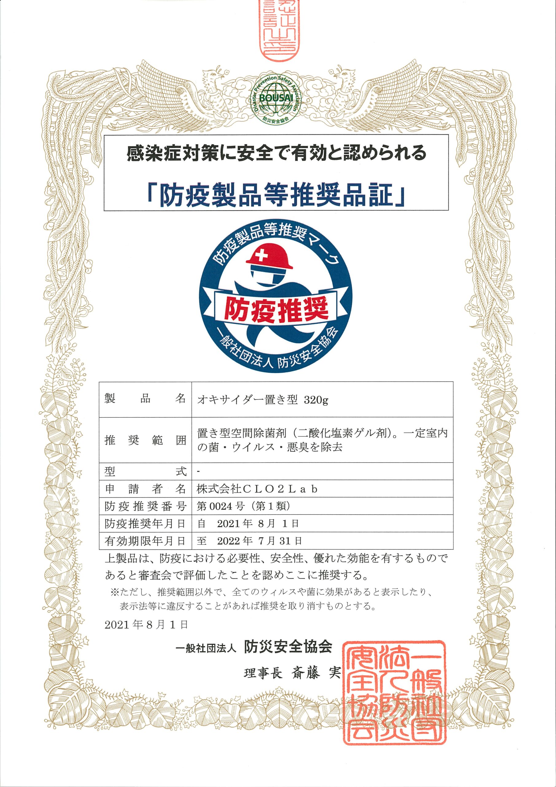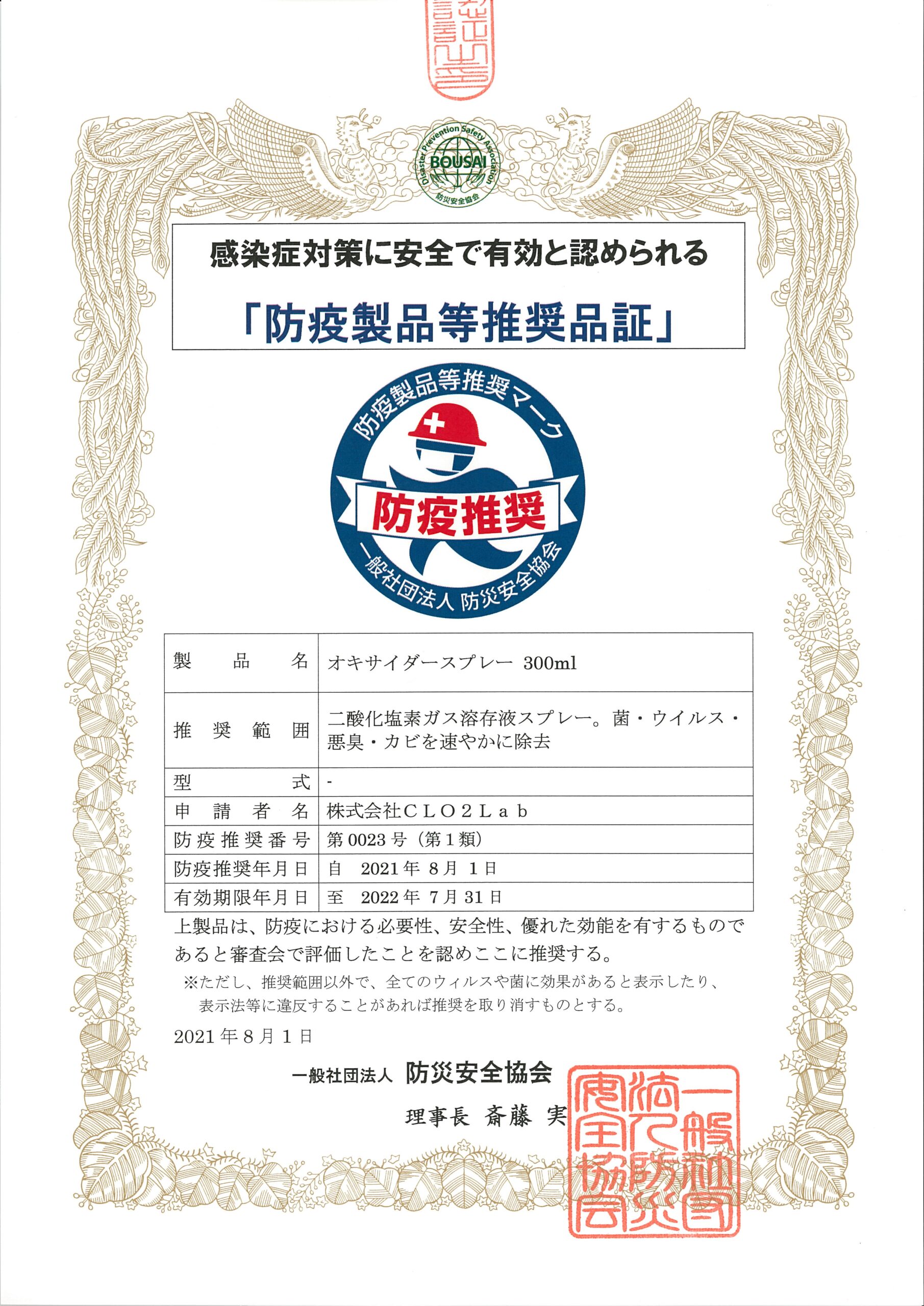 感染症対策等に役立つと認められる「防疫製品認証制度」において、当社が製造・開発しております“オキサイダー” は防疫分野において有益な活用が可能で安全性、機能性、利便性に寄与 する製品として認証されました。